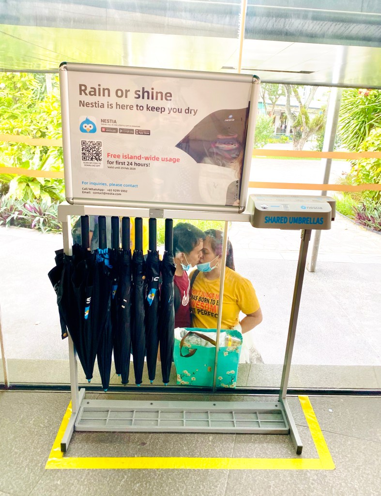 最近是新加坡的雨季,常常上午還是萬里無雲,下午就暴雨不停! 遇到這種時候帶著大小C卻沒雨具在身邊,真的也會欲哭無淚。某次去植物園出捷運站時,在出口看到這台掛滿雨傘的機器就覺得很有趣,忍不住先拍下來想說回家研究一下,但沒想到拍到後面難分難捨的情侶,我真的不是故意拍你們的。